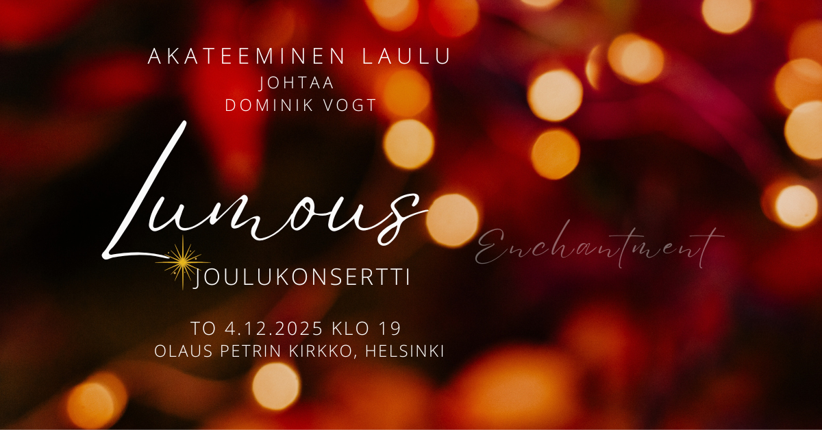Akateeminen Laulu's traditional Christmas concert is titled Enchantment (Lumous in Finnish). The concert brings light and sparkle to the winter night. We'll present a program of Finland's most beloved carols by masters like Jean Sibelius, Leevi Madetoja, Selim Palmgren, and P. J. Hannikainen, alongside exciting ancient carols and seasonal songs for festive celebrations such as the Norwegian Ola Gjeilo's beautiful Northern Lights and the Swiss Ivo Antognini's Canticum Novum. This year, our concert at Olaus Petri Church will also feature famous Swedish carols.